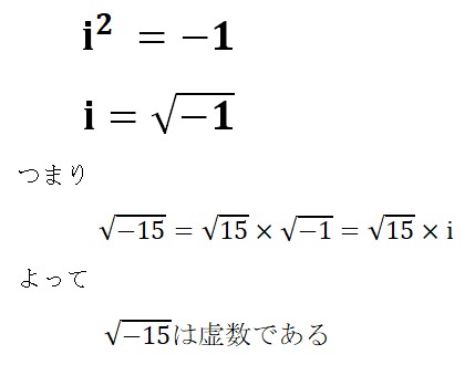 √-15というのはルートの中にマイナスが入っているのであり得ないのです、この部分が虚数ということです。